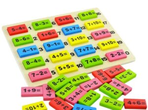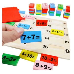 NOTE: Do not bring out all the tiles at once. First introduce addition only ( keep away subtraction) when the child has mastered addition, remove addition and present subtraction alone. This keeps the child focus and build concentration focus.