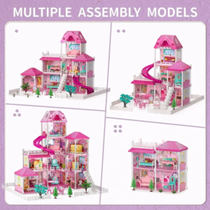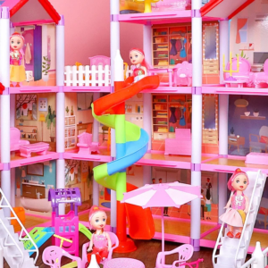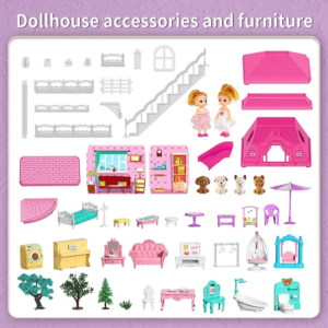 Accessories: The dollhouse comes with a variety of accessories, including slides, stairs, fences, a dressing table, sofas, a piano, a rocking chair, pets, a bathtub, a toilet, a TV, a refrigerator, and a dining table. Each room is uniquely decorated, but children can also create their own designs according to their preferences. This allows for full play of the children’s imagination.